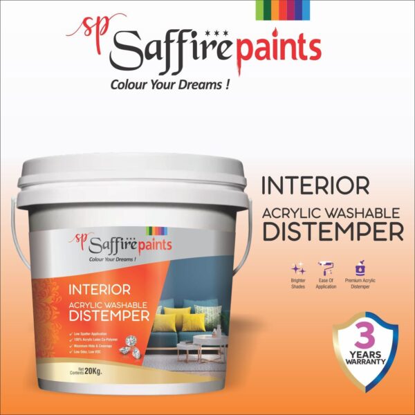 All previous coating of Distemper or the lime wash must be removed. Ensure the surface is dry & free from dirt before application of Saffire Paints Acrylic Distemper. Apply a coat of Cement Primer for the proper surface. Saffire Paints Acrylic Washable Distemper is applied as a thick paste. Thin 1kg New Same Acrylic Distemper with 500-600ml of water. Slowly add water while continuing to stir the mixture. Add 2-3 coats with a brush, with a minimum drying time of 3-4 hours between coats.