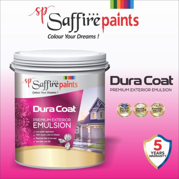Saffire Paints Duracoat Premium Emulsion gives a smooth finish to the Exterior Walls. It is a perfect buy if you have been using Distemper till now.